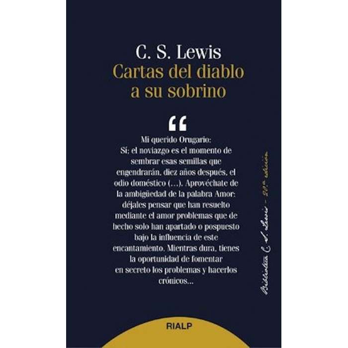 La originalidad de su planteamiento, el acertado estilo literario y la agudeza de su autor, hacen de este título uno de los más apreciados y brillantes de Lewis. El libro está compuesto por un conjunto de cartas breves que un demonio ya anciano escribe a un demonio joven -su sobrino- para enseñarle el oficio de tentar a los humanos. A través de esa correspondencia se van planteando importantes cuestiones que afectan a la vida de todos. Lewis describe con gran acierto las corrientes de pensamiento, las costumbres y hábitos de vida más extendidos en el mundo actual, y alterna esa descripción con una crítica certera. Sus novedosos razonamientos se exponen en un estilo ingenioso y ameno, muy atractivo para el lector medio. C. S. Lewis nació en Irlanda en 1898, se educó en el Malvern College durante un año, y luego privadamente. Fue Tutor en el Magdalen College y profesor de Literatura en Cambrigde. Ateo en su juventud, describió su conversión al cristianismo como una experiencia que transformó su vida y su obra. Dotado de una inteligencia excepcional y de un ingenio certero y lúcido, ejerció una gran influencia tanto en sus alumnos como en sus lectores. Cultivó con igual maestría el ensayo, la novela y la literatura infantil. Mientras no tengamos rostro, El diablo propone un brindis, Los cuatro amores , El problema del dolor, Mero cristianismo, Lo eterno sin disimulo, El gran divorcio, Si Dios no escuchase, son algunas de sus obras más célebres.